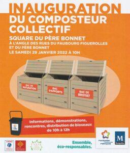 L’installation s’est faite dans un petit parc (angle rue Père Bonnet x rue Faubourg Figuerolles). Elle a été inaugurée le 29 janvier 2022 avec distribution de bio-seaux d’une contenance de 2 kg de matière (une semaine de collecte pour 2 personnes).