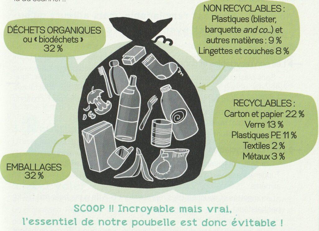 Plus que de longs discours, nous empruntons à l’ouvrage de Jérôme Pichon et Bénédicte Moret (Famille presque ZERO DECHET : ZE GUIDE -Editeur France Quercy, 2016) le schéma du scan d’une poubelle ménagère grise. Il illustre parfaitement le fait que nos poubelles triées à la source peuvent maigrir jusqu’à représenter seulement 32% du volume initial, réduit au volume des déchets organiques.